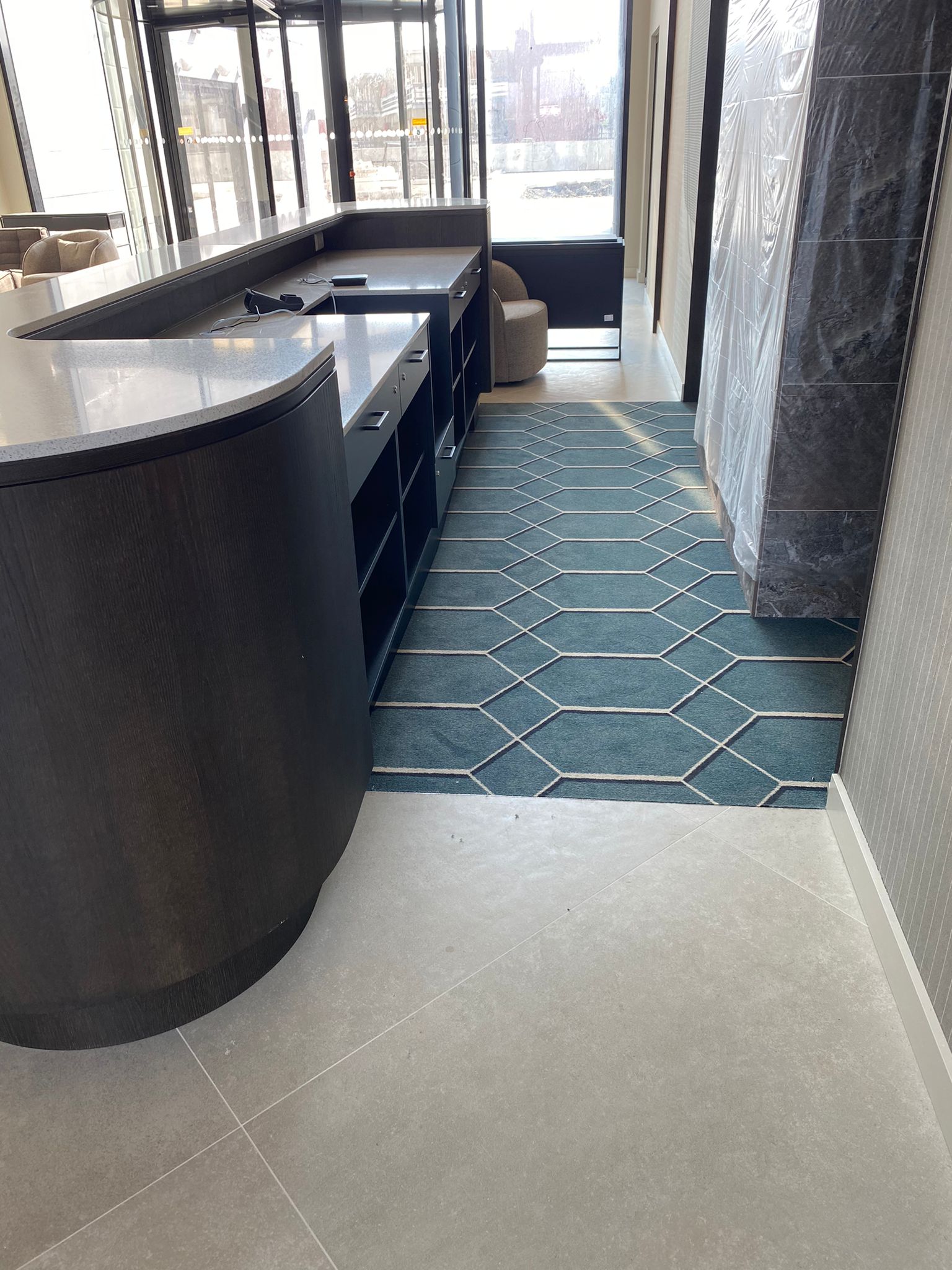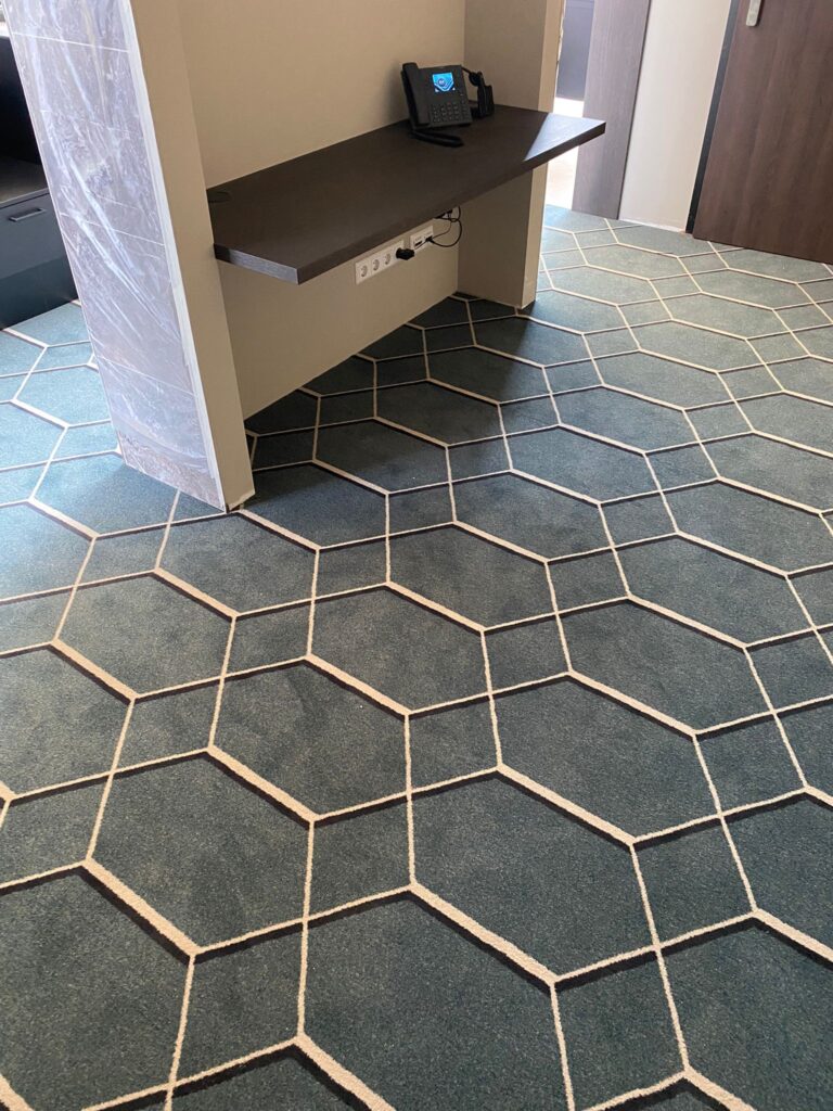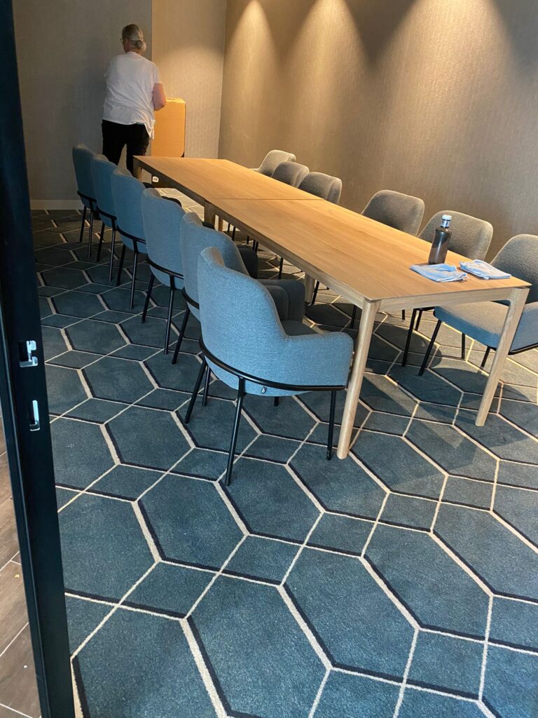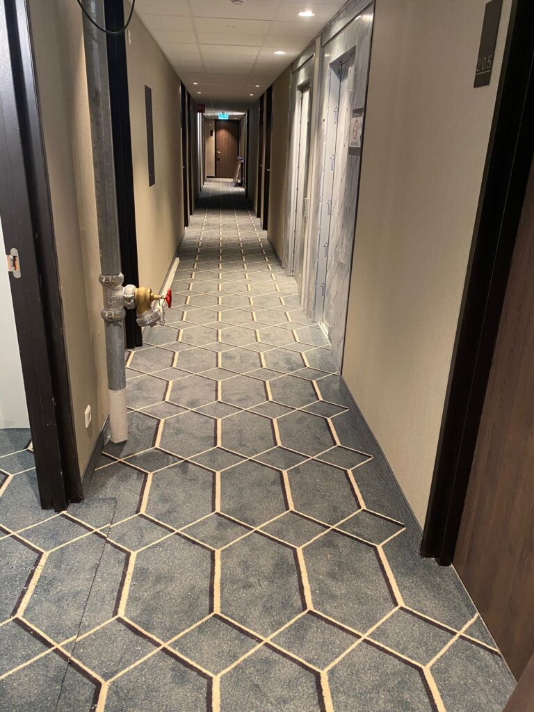Er is ca. 900 m2 chique EGE tapijt aangebracht + bijbehorende plinten. Daarnaast mochten we ook 20 m2 schoonloopmatten aanbrengen.