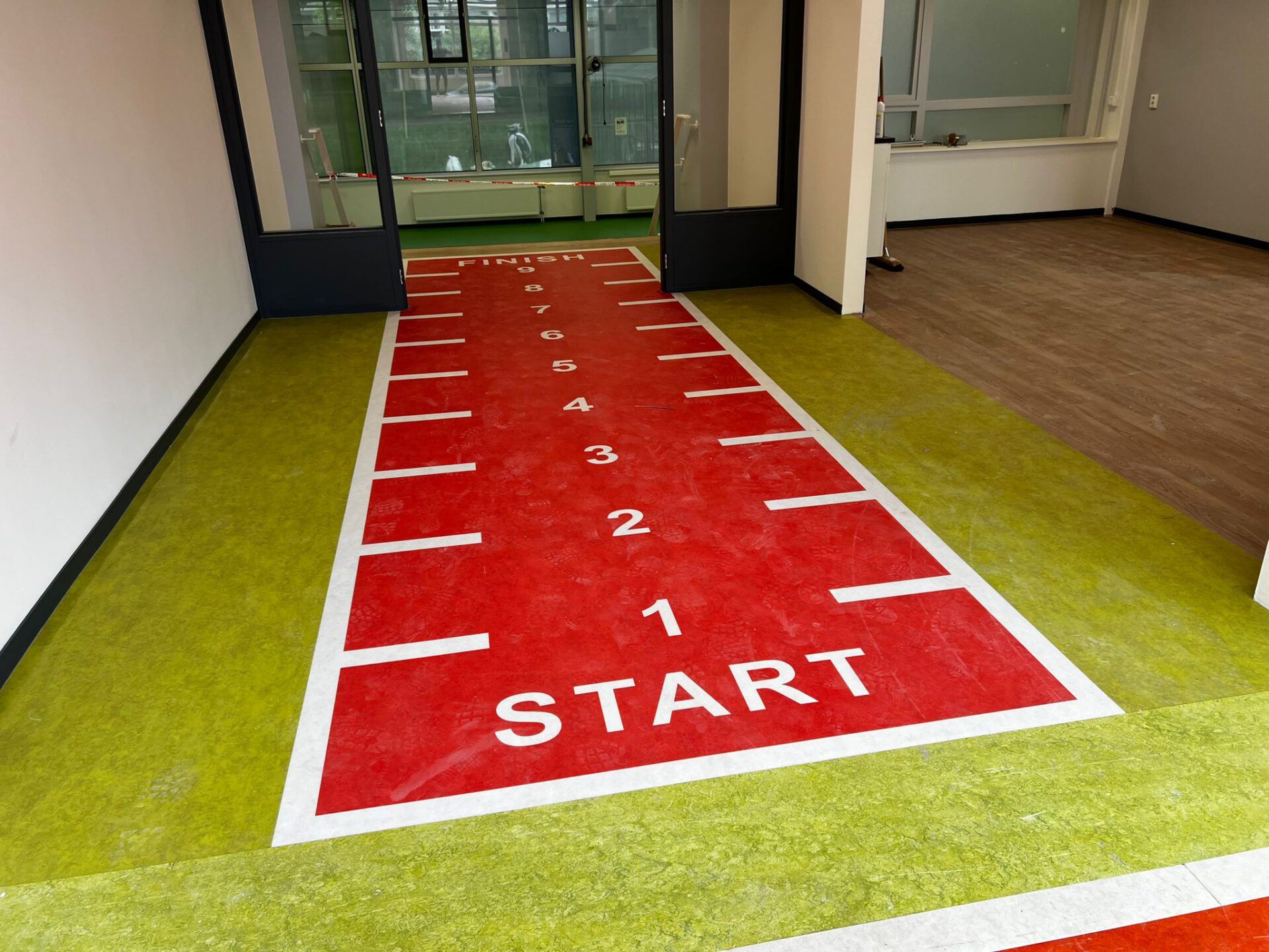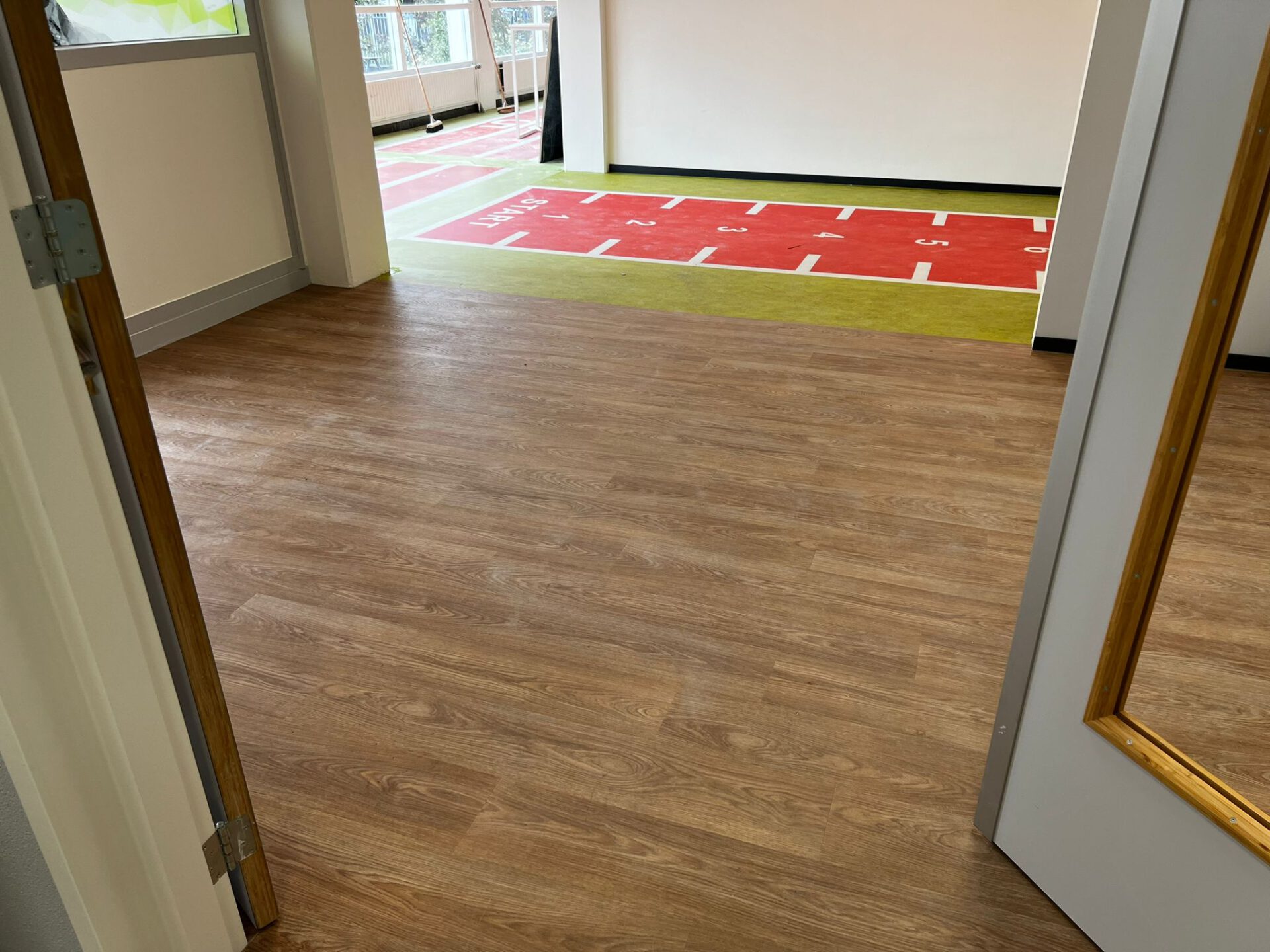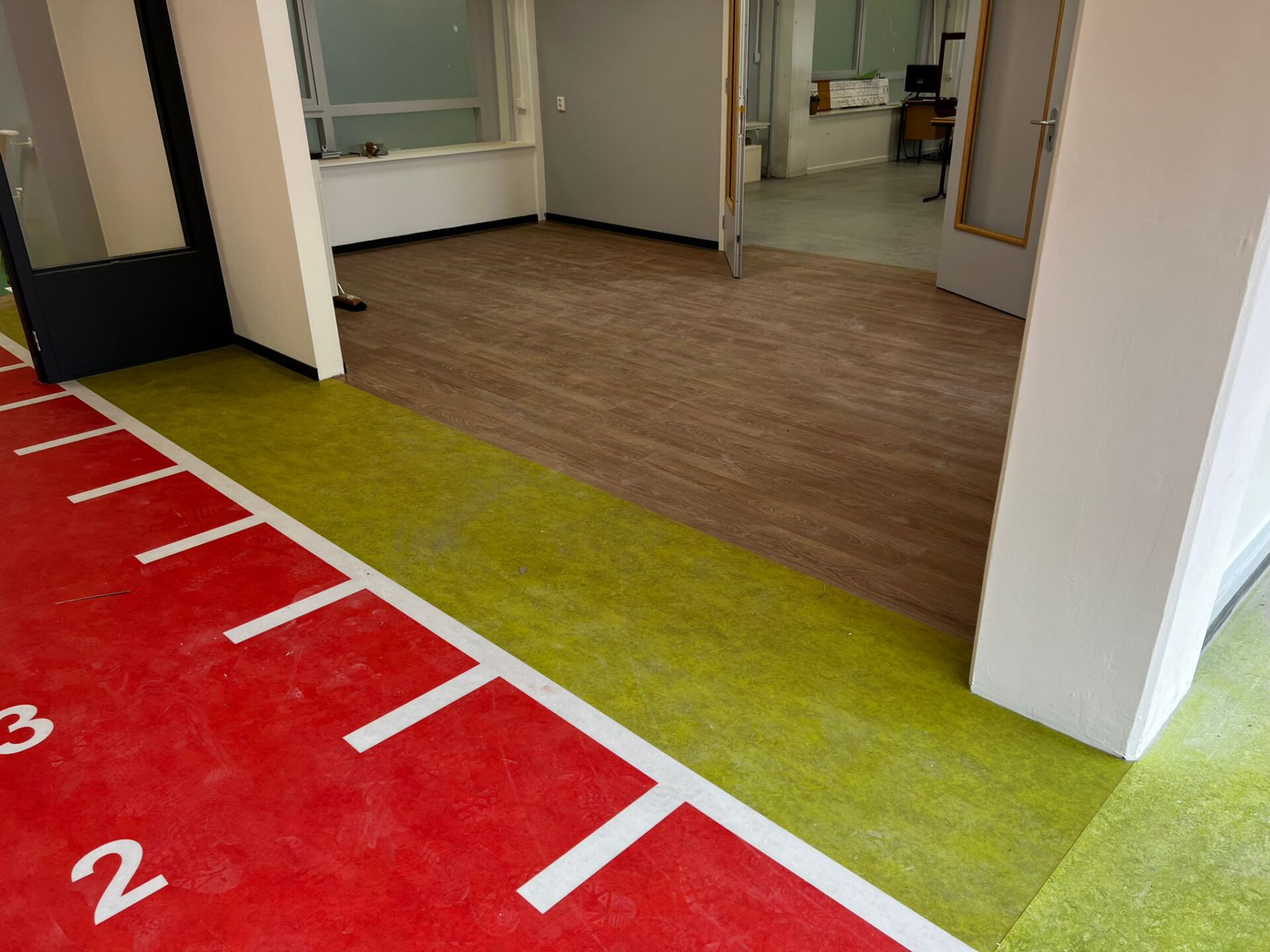 Bij dit beweegcollege hebben we mooie marmoleum vloeren aangelegd en op de trappen. Verder hebben we een marmoleum vloer met een sprintbaan erop geprint aangelegd.