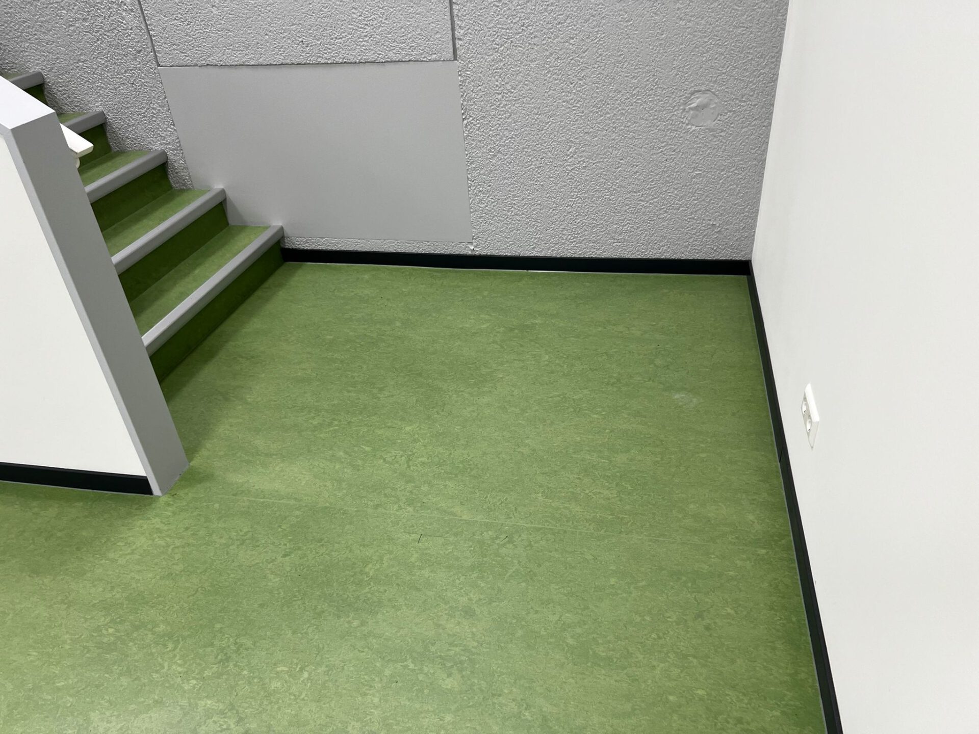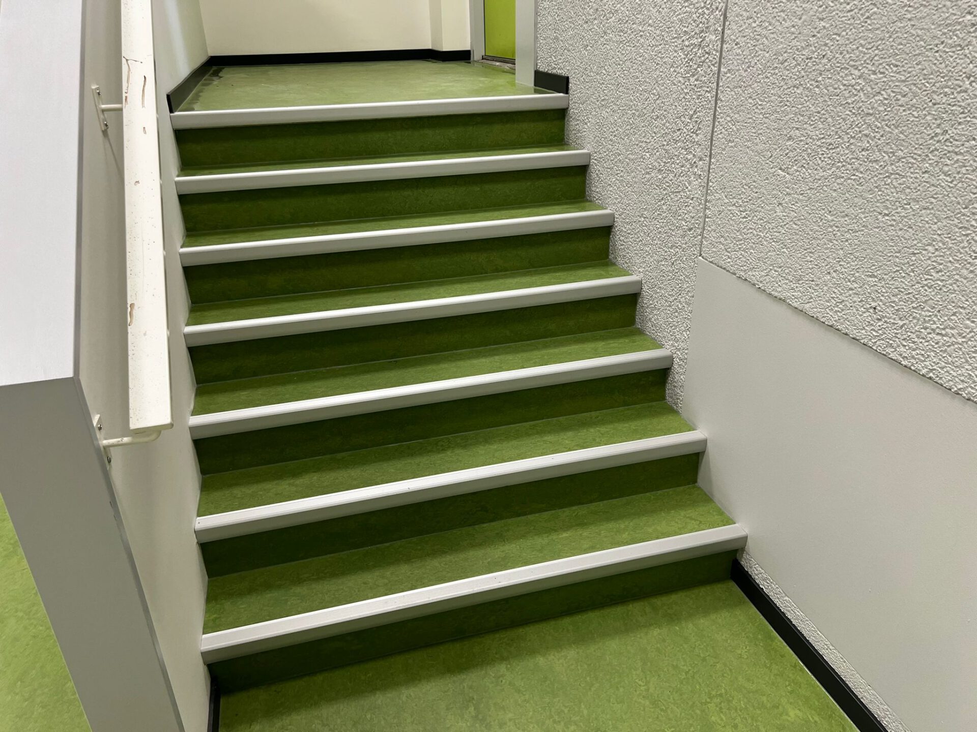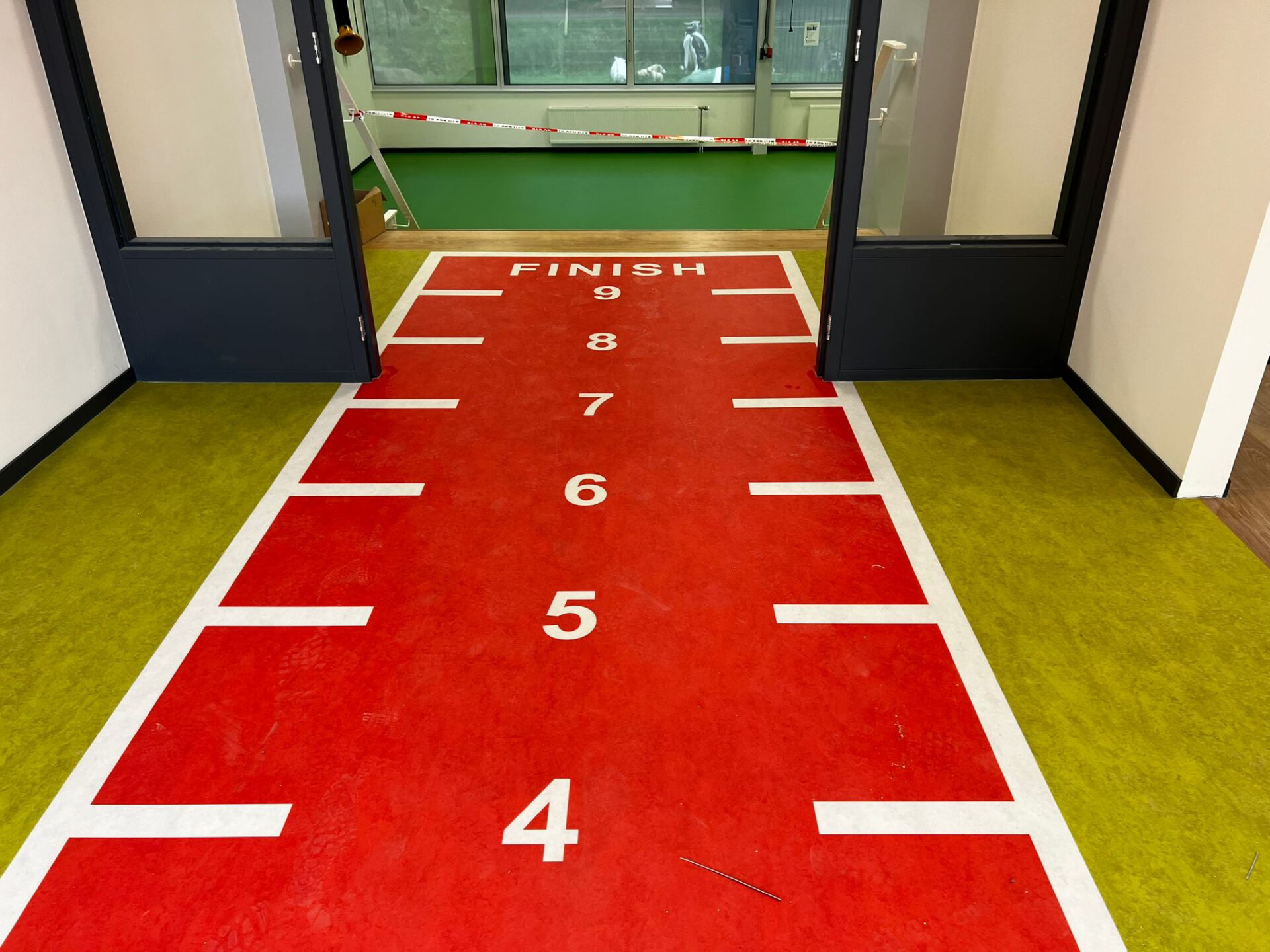 Bij dit beweegcollege hebben we mooie marmoleum vloeren aangelegd en op de trappen. Verder hebben we een marmoleum vloer met een sprintbaan erop geprint aangelegd.